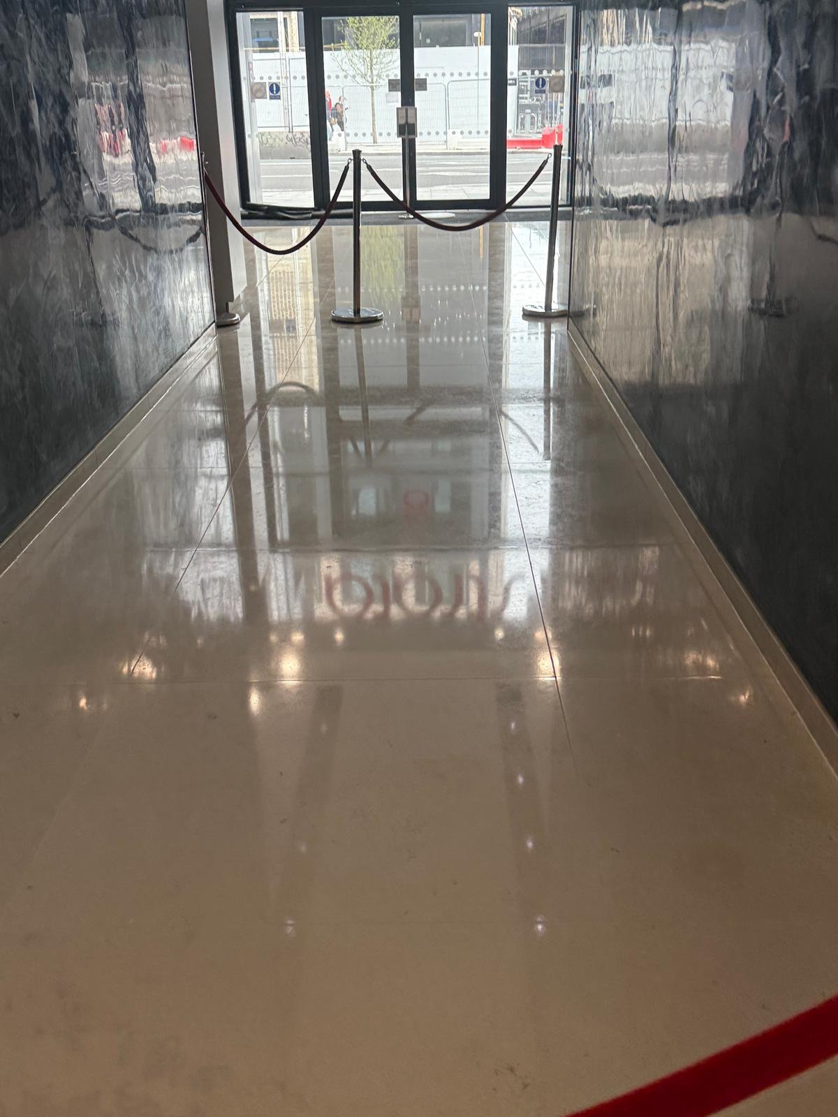 This project involved professional marble floor polishing at the main entrance of Strata SE1 in Elephant & Castle, London. The goal was to restore the floor’s original shine and achieve a high-gloss, luxury finish suitable for a high-traffic residential building. Our team used advanced polishing machines and multi-stage diamond refinement to remove dullness, surface marks, and wear. The process was carefully executed to enhance reflection, clarity, and durability while maintaining the integrity of the marble. The final result delivers a clean, highly reflective surface that elevates the entire entrance space and leaves a strong first impression.